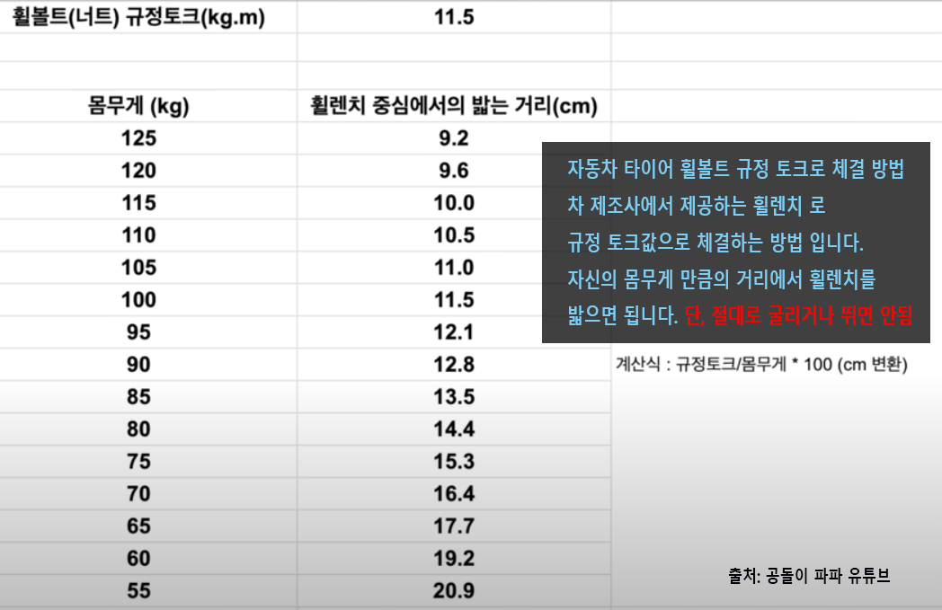 타이어 휠 너트 조임시 규정 토크값으로 체결 하는것을 추천 합니다.