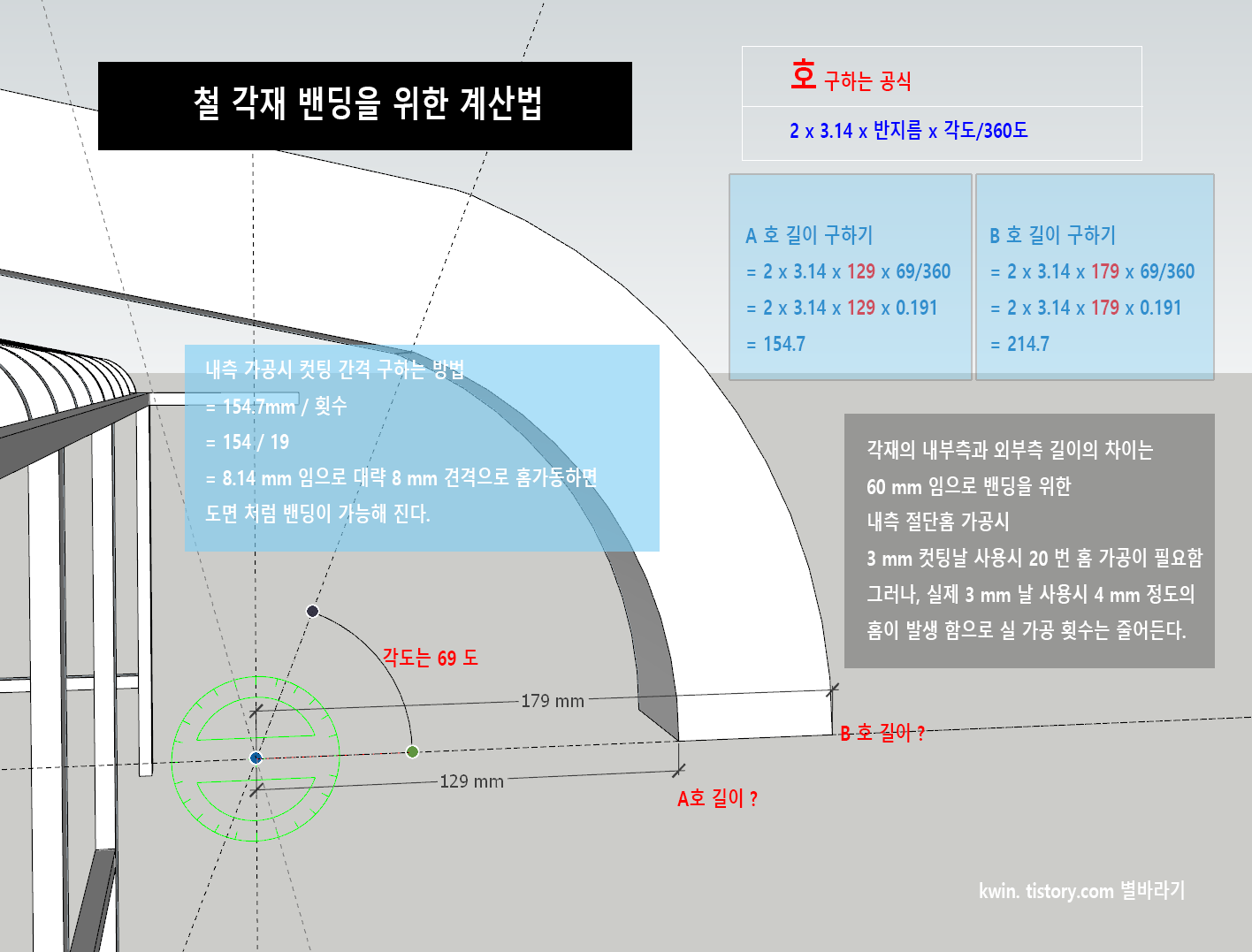 DIY 철 각재 밴딩시 내측에 몇번의 그라인딩 으로 홈을 만들어야 원하는 밴딩이 되는지에 대한 계산 입니다.