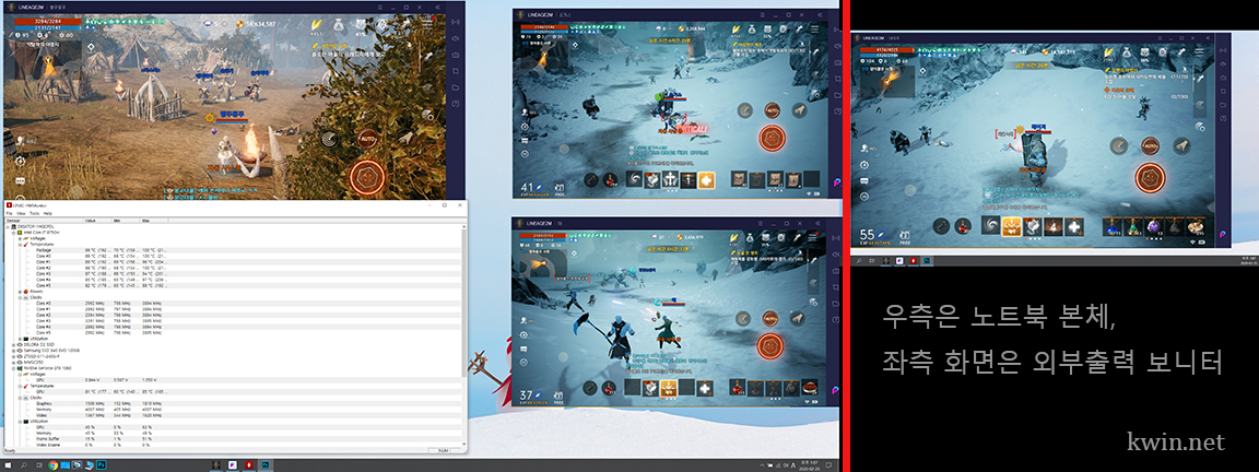선풍기는 제거 한 상태에서, 리니지2M 4캐릭을 돌리면서, 인터넷을 하는 상태에서 의 온도는 80~85도를 유지 합니다.
